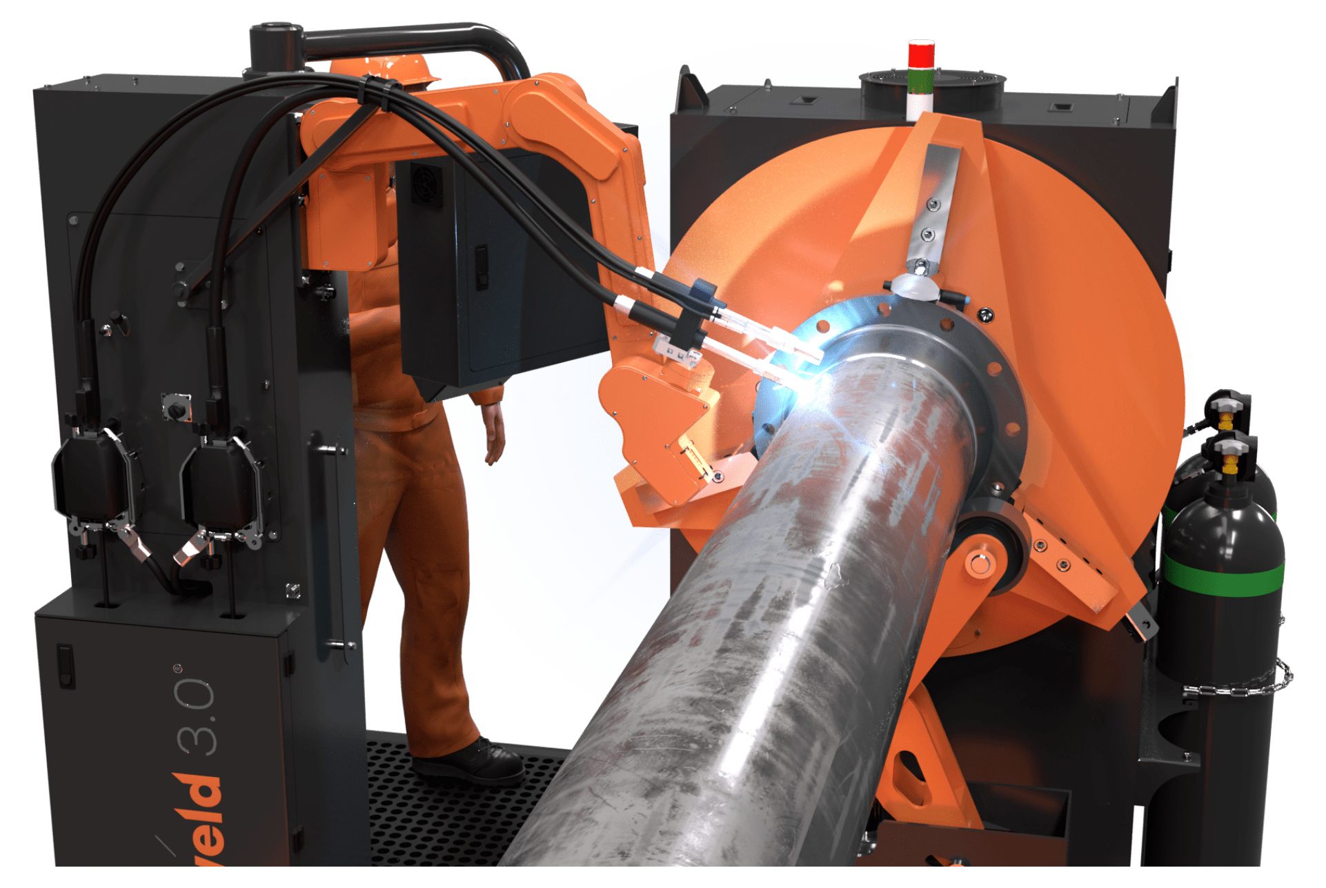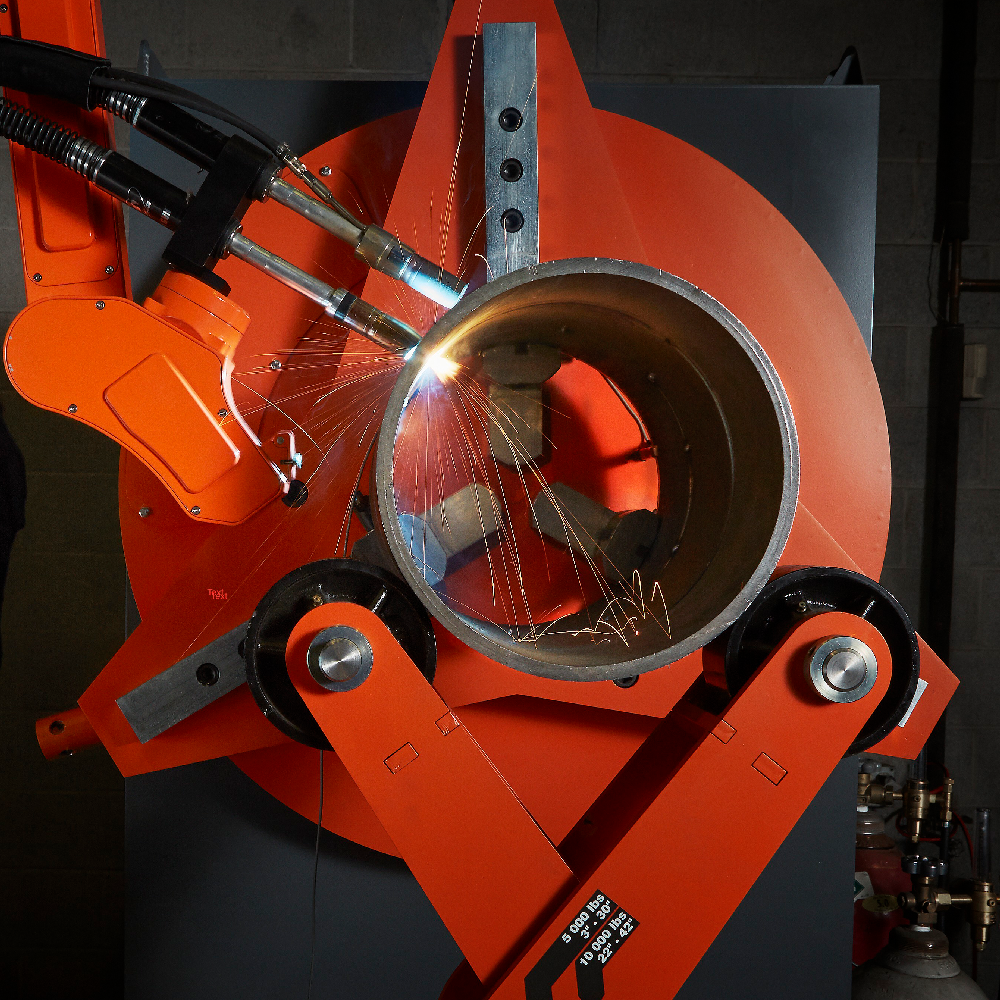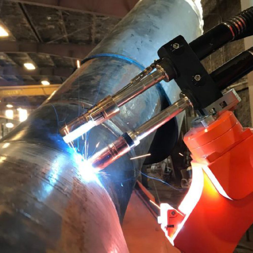 Workcell developed specifically for industrial pipe pre-fabrication STT root pass and spray filling passes.